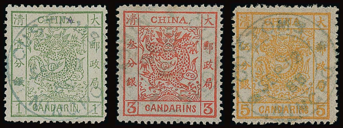Customs Datestamp: 1888 dates; 1ca. to 5ca. set of three cancelled by the Customs c.d.s. in blue, with 1ca. pale green dated (12 Sept.), 3ca. vermilion dated (15 July) and 5ca. yellow dated (12 Sept.). A fine and very scarce set. (3). Photo