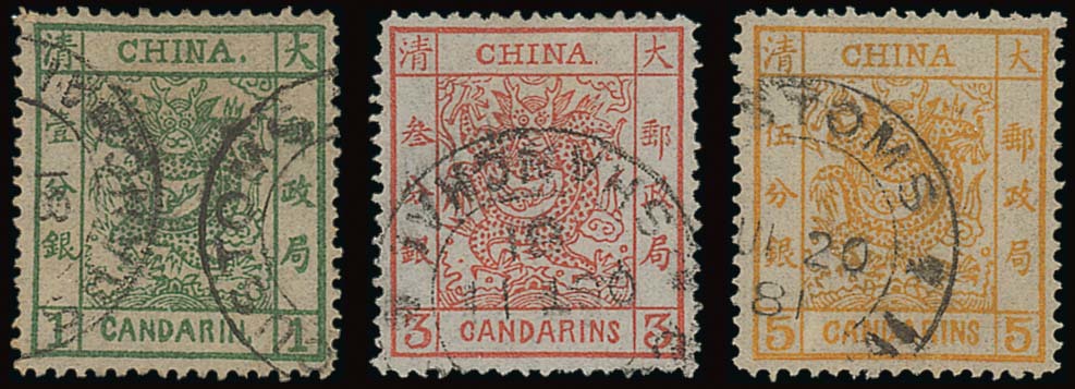 — 1881 dates; 1ca. to 5ca. set of three with 1ca. deep green bearing two part strikes clearly showing the year, 3ca. dull red [10] dated (11 Oct.) and 5ca. bright orange-yellow dated (20 July), all the datestamps in black. Good to fine. (3). Photo