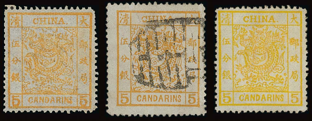 An interesting group with wide setting set of three cancelled by large Tientsin type 2 seal; unused with thin paper 5ca. (2), wide setting 3ca. and thick paper 5ca.; a few small faults but an attractive group. (7). Photo