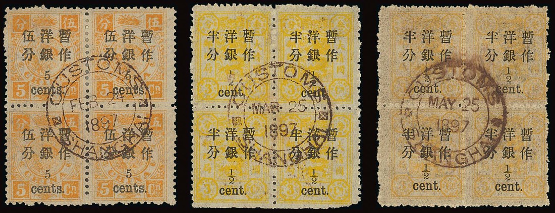 A group of blocks of four with 4c. on 4ca. (a few trimmed perfs. at foot) and 5c. on 5ca. with central strikes of Shanghai Customs c.d.s., also Large Figures, Wide Setting ½c. on 3ca. (straight edge at foot) with a central strike of Shanghai Customs dated 1897 (25 Mar.), a very early date, plus Large Figures, Narrow Setting ½c. on 3ca. buff tied by a central strike of Shanghai Customs c.d.s. dated 1897 (25 May) the earliest date we have recorded for any Narrow Setting stamp. An attractive and interesting group. Photo