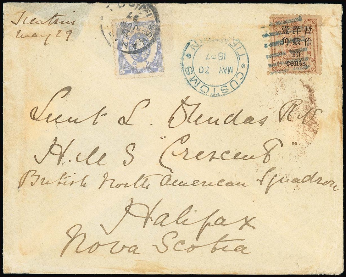 1897 (20 May) opened-out envelope to Lieut. Bleudas on H.M.S. 'Crescent' serving on the North America Squadron at Halifax, Nova Scotia, bearing Small Figures 10c. on 6ca. tied by blue pa-kua with "customs/tientsin" c.d.s. alongside, also in blue, plus Japan 5s. Koban tied by "shanghai/i.j.p.o." c.d.s.; the reverse with Shanghai Dollar chop in reddish black, Yokohama (17.6), Vancouver (30.6) and part Halifax c.d.s. There is a light horizontal crease at top which affects the adhesives. A very good cover to an unusual destination, routed via Vancouver. Photo
