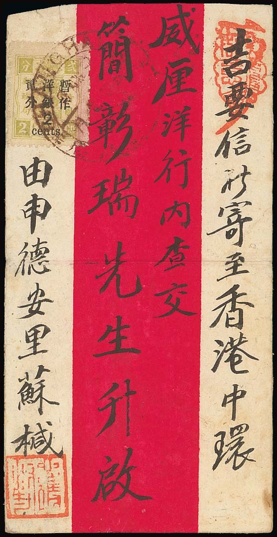 1897 (6 Aug.) red band envelope to Hong Kong bearing Large Figures, Narrow Setting 2c. on 2ca. dull yellow-green tied by Shanghai type B Dollar chop in reddish brown, with Hong Kong arrival c.d.s. (7.8) on the reverse; central folding crease, otherwise good. B.P.A. Certificate (2010). Photo