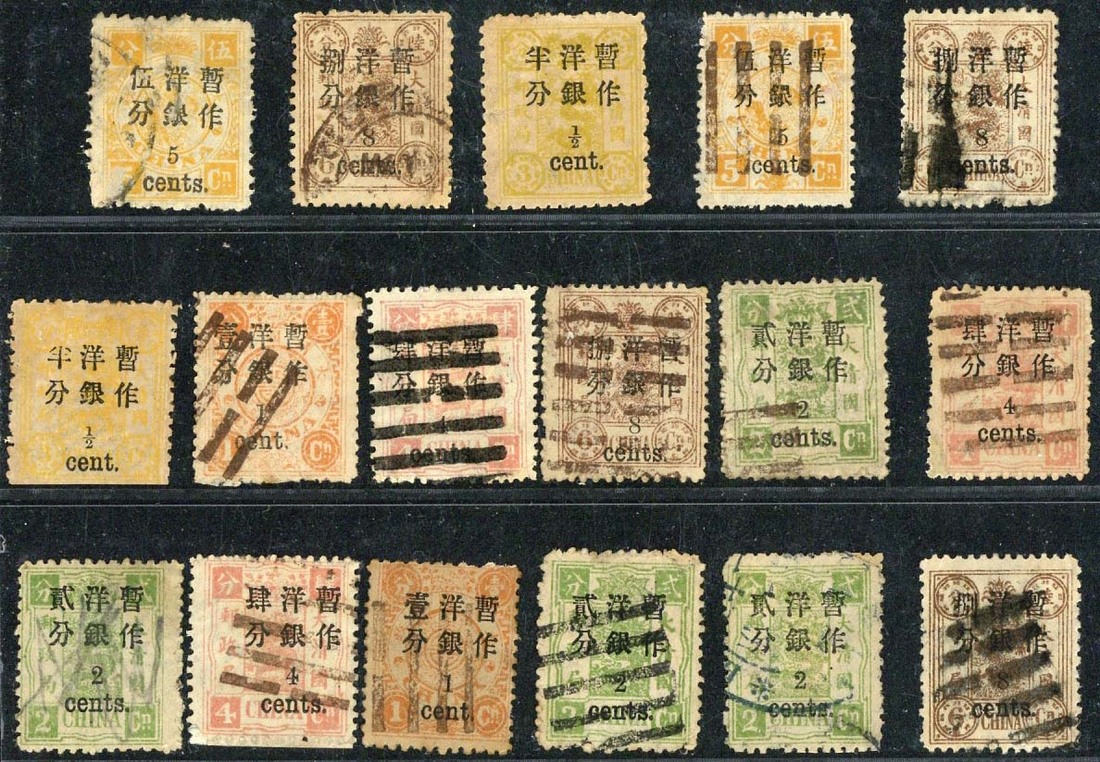 A selection of postmarks with Small Figures values to 8c. on 6ca. (4), most bearing pa-kua cancellations; Large Figures with values to 10c. on 12ca. (2) showing a variety of postmarks. Condition varies. (37)