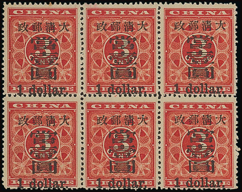 $1 on 3c. [11/17] block of six, large part original gum or unmounted mint (4); deep rich colour with the surcharge centred unusually low; the left vertical pair has been folded and there are some split perforations at top and [11] had a small perf. tone at top. Outstanding quality and a very rare and desirable multiple. Photo