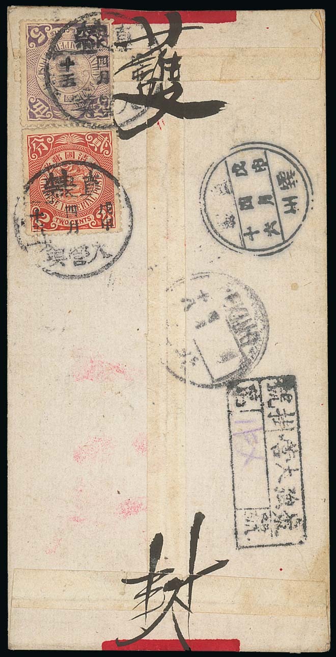 — 1908 (15 Apr.) red band envelope registered to Peking bearing, on the reverse, C.I.P. 2c. and 5c. tied by Tayingchin datestamps, a very fine strike of the boxed registered handstamp, transit and Peking arrival c.d.s. A good cover. Photo
