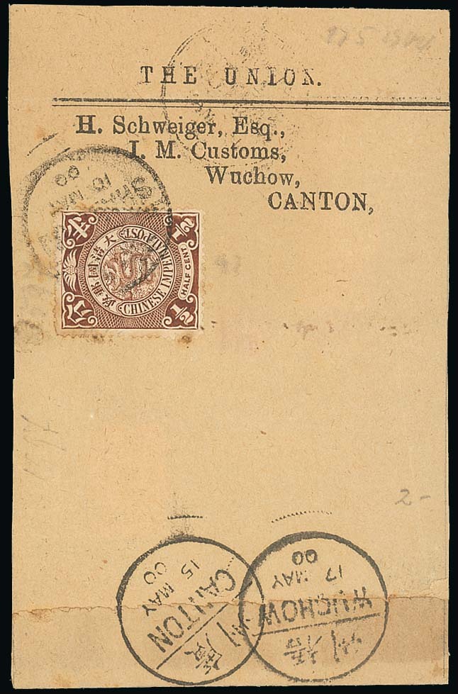 Newspaper Wrappers: 1900 (10 May) opened-out The Union wrapper bearing ½c. brown tied by Shanghai bilingual c.d.s., addressed to Wuchow and bearing fine strikes of Canton and Wuchow bilingual c.d.s. Clean and attractive. Photo
