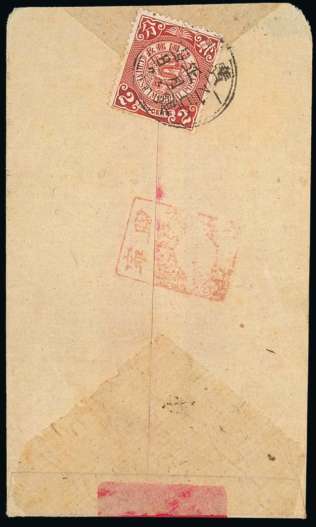 — 1905 (14 May) small red band envelope bearing, on the reverse, 2c. deep red tied by Kweichow province lunar dater with a light strike of rectangular dater, number "1" with horizontal line, struck in red. Reduced at top, otherwise a fine and neat cover. Photo