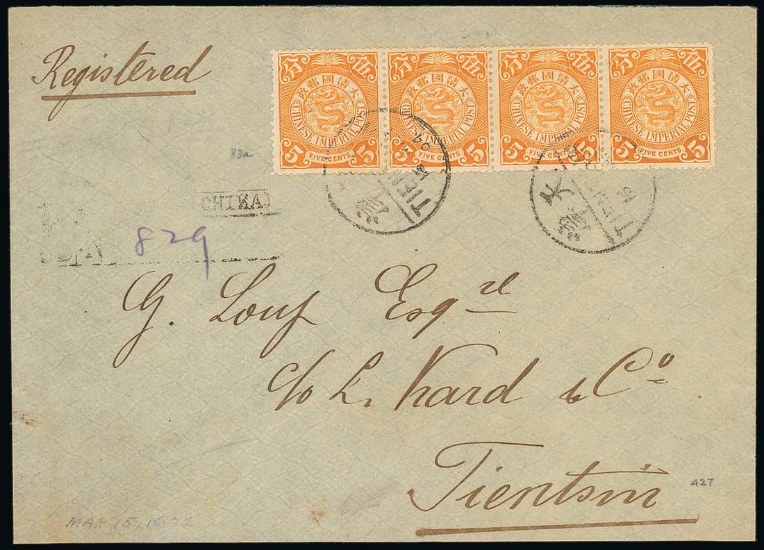 Registered Mail: 1904 (15 Mar.) local Tientsin registered cover bearing 5c. orange strip of four tied by bilingual Tientsin c.d.s. with a light strike of the registration handstamp at left; very fine and a scarce value on cover. Photo