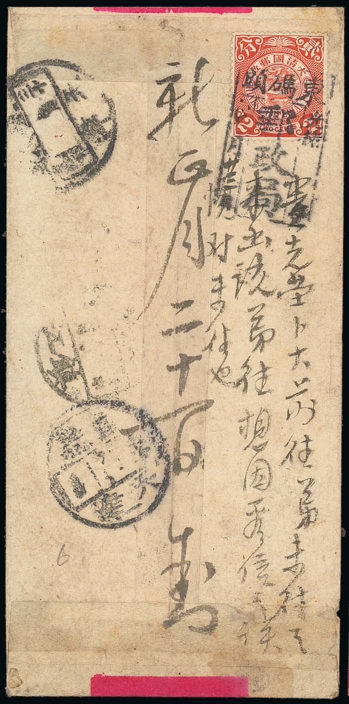— 1908 red band envelope to Tientsin bearing, on the reverse, C.I.P. 2c. red-brown tied by a fine strike of the Tungmatow Post Office rectangle with date insertion, with manuscript date; also fair strikes of Chinkiang transit and Tientsin arrival. Some light soiling but a very clear strike. Photo