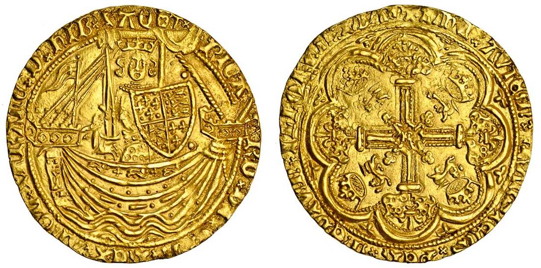 (x) Richard II (1377-1399), Noble, 7.72g, Calais, Series IIIC with French title resumed, m.m. cross pattée ricard dei gra rex angl d hib z aqt, king standing facing in ship, holding sword and shield, flag at stern, lion on rudder, pellet above and below the shield, rev. + ihc avtem transiens per medivm illorvm ibat, floriate cross with lis at ends, r in centre, double saltire stops (North 1307 (2); S.1663), double struck on reverse, good very fine
