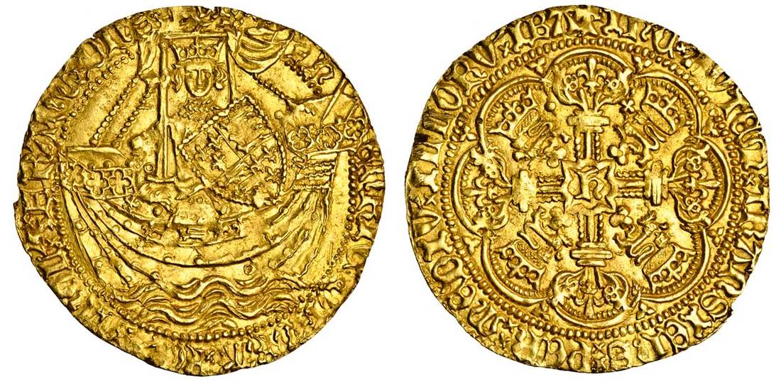 (x) Henry V (1413-1422), Noble, 6.95g, type E, London, henric di gra rex angl z franc dns hyb, king standing facing in ship, holding sword and shield, pellet at sword point, mullet and annulet by sword arm, trefoil by shield, annulet on ship, rev. + ihc avtem transiens per mediv illorv iba, floriate cross, h in centre, extra pellet in one quarter and saltire in another (cf. Schneider 251; N.1373; S.1744), about extremely fine with good portrait