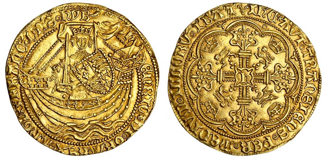 (x) Henry VI (first reign, 1422-1461), Noble, 6.95g, annulet issue, London, mule with obverse of Henry V, class G, m.m. lis on reverse only, henric di gra rex angl z franc dns hyb, king standing facing in ship, holding sword and shield, mullet after henric struck over an annulet, rev. ihc avt transiens per medivm illorv ibat, floriate cross with lis at ends, mullet after ihc, annulet in one spandrel (cf. Whitton p. 79 (b); Schneider 269; North 1375/1414; S. 1800), an attractive coin, extremely fine, very rare