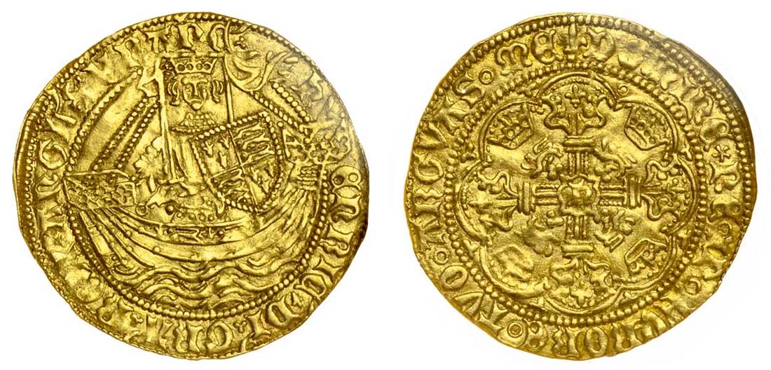 (x) Henry VI (first reign, 1422-1461), Half-Noble, annulet issue, London, m.m. lis on reverse, henric di gra rex angl z franc, king standing facing in ship, holding sword and shield, rev. domine ne in fvrore tvo argvas me, floriate cross (N.1417; S.1805), the Half-Noble is rarer in high grade than the Noble, an exceptionally round and well-struck example, NGC graded MS-64