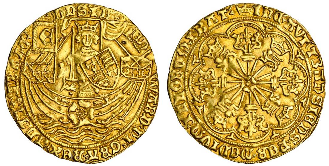(x) Edward IV (first reign, 1461-1470), light coinage 1466-67, Ryal or Rose Noble, 7.63g, London, m.m. crown on reverse, edward di gra rex angl z franc dns hi, king standing facing in ship, carrying sword and shield, rose on side and flag with E, rev. ihc avt transiens per medivm illorvm ibat, rose over sun with fluers in spandrels (Schneider 363; N.1549; S. 1950), very fine, wavy flan