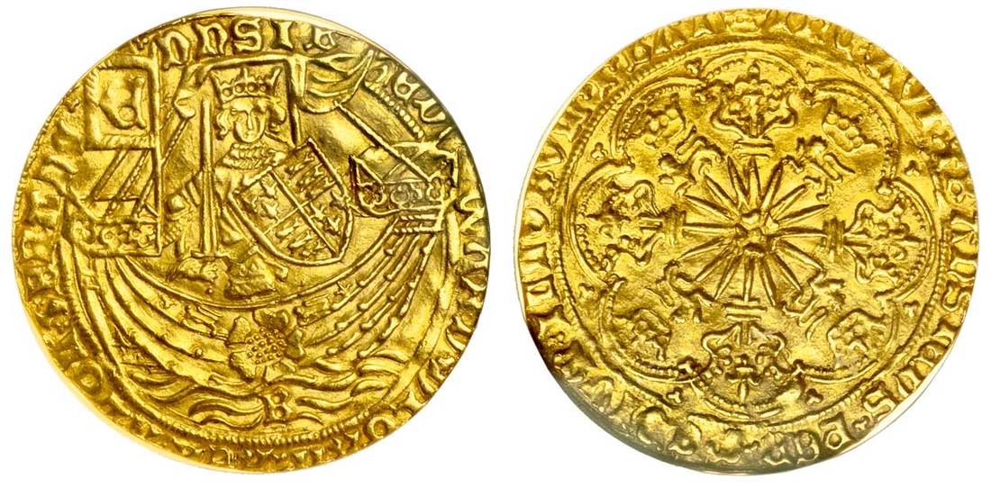 (x) Edward IV (first reign, 1461-1470), light coinage 1464-70, Ryal, 7.61g, Bristol mint, m.m. crown on reverse, edward di gra rex angl z franc dns i b, king standing facing in ship, holding sword and shield, b in waves below, rev. ihc avtem transiens per medivm illorvm ibat, crowned sunburst, rose in center, small trefoils in spandrels (Schneider 419; N.1550; S.1954), lustrous with crisp strike on a round flan, not quite full, legends and the king’s facial features especially well detailed, about extremely fine, rare, NGC graded MS-63