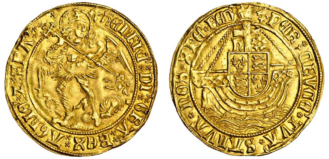 (x) Henry VII (1485-1509), Angel, 5.18g, class V, m.m. cross crosslet, henric di gra rex aglie z fra, St. Michael vanquishing Satan, both feet on dragon, cross crosslet spear shaft, one saltire by halo, rev. per crvcem tva salva nos xpe red, cross dkividing h and rose above shield within ship, double saltire/rosette stops, double rosette after per (cf. Schneider 536 (obv.); PW class II(b), 2 var.; N.1698; S.2186), a full round crisply struck coin, almost extremely fine, this reverse die, with a double rosette stop after per, is apparently unpublished, very rare