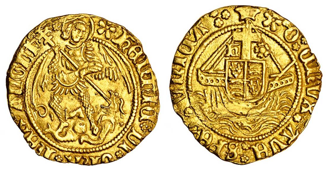 (x) Henry VII (1485-1509), Half-Angel, 2.54g, type III, m.m. pansy, henric di gra rex angli, St Michael vanquishing Satan, rev. o crvx ave spes vnica, cross dividing h and rose above shield within ship (N.1700; S.2189), a superb piece, almost extremely fine