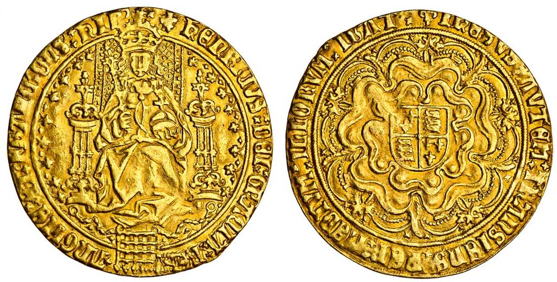 (x) Henry VIII (1509-1547), second coinage, Sovereign, 15.31g, , m.m. lis (over sunburst on obverse) henricvs dei gracia rex anglie et franc dns hib, king enthroned holding orb and sceptre, portcullis at feet, rev. ihesvs avtem transiens per medivm illorvm ibat, square-topped shield on Tudor rose, within double tressure, double saltire stops (Whitton O1d/R4; Schneider 570/1 (same obv./rev. dies); N.1782; S.2267), struck on a small flan, very fine scratches in field, very fine or better, rare