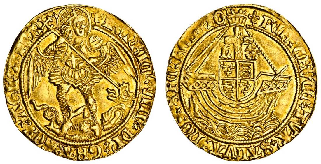 (x) Henry VIII (1509-1547), second coinage, Angel, 5.11g, m.m. lis, henric viii di gra rex agl z fra, St. Michael vanquishing Satan, rev. per crvce tva salve nos xpe redeto, cross dividing h and rose above shield within ship, double saltire stops (cf. Schneider 574; N.1783; S.2268), faint scratch in obverse field, a clear and evenly toned coin, very fine, very rare