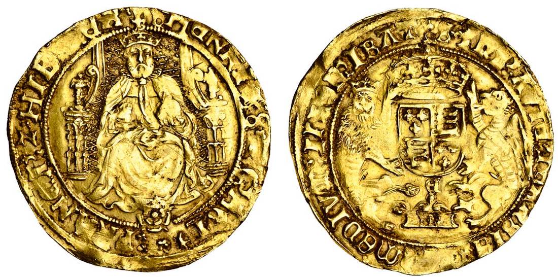 (x) Henry VIII ( 1509-1547), third coinage, Half-Sovereign, 6.20g, Southwark, s henric 8 d g agl franci z hib rex, king enthroned facing, holding orb but no sceptre, rose below, rev. s ihs avte transiens per medivm illor ibat, crowned shield with lion and griffin supporters, E below (Schneider -; N.1828; S.2297), about extremely fine on a full flan with good portrait of king, rare variety without the sceptre