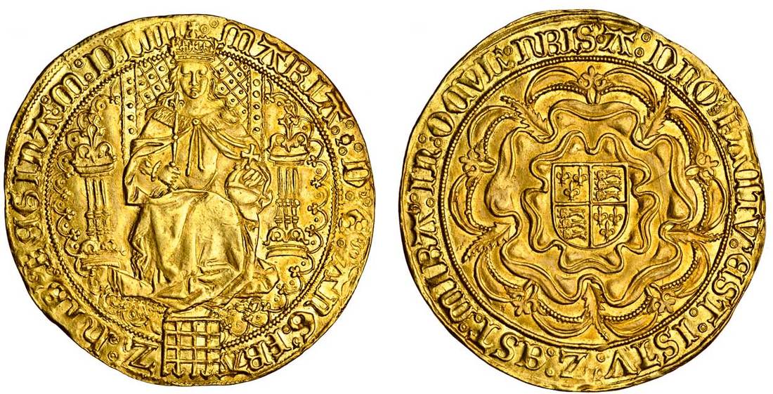 (x) Mary (1553-1554), Sovereign, 15.32g, 1553, m.m. pomegranate, maria d g ang fra z hib regina mdliii, queen enthroned holding orb and sceptre, portcullis at feet, rev. a dno factv est istv z est mira in ocvl nris, square-topped shield in centre of Tudor rose, within double tressure, double annulet stops, single annulet after nris (Schneider 704 same obverse die; N.1956; S.2488), very slightly creased, a small scratch to right of shield, otherwise a sharply struck coin with excellent portrait, and original bright underlying luster, almost extremely fine, rare