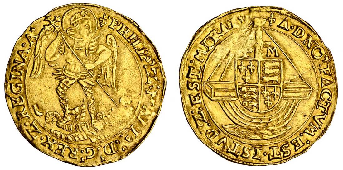 (x) Philip and Mary (1554-1558), Angel, 5.15g, m.m lis, philip'. z: maria: d'. g'. rex. z. regina. a', St Michael of old style with small wings, vanquishing Satan, rev. a. dno'. factvm: est. istvd: z: est: mirab', cross dividing p-m above shield on rudderless ship, wire line inner circles both sides (Schneider 727 same obverse die; N.1965; S.2496), good very fine on a full round flan, rare