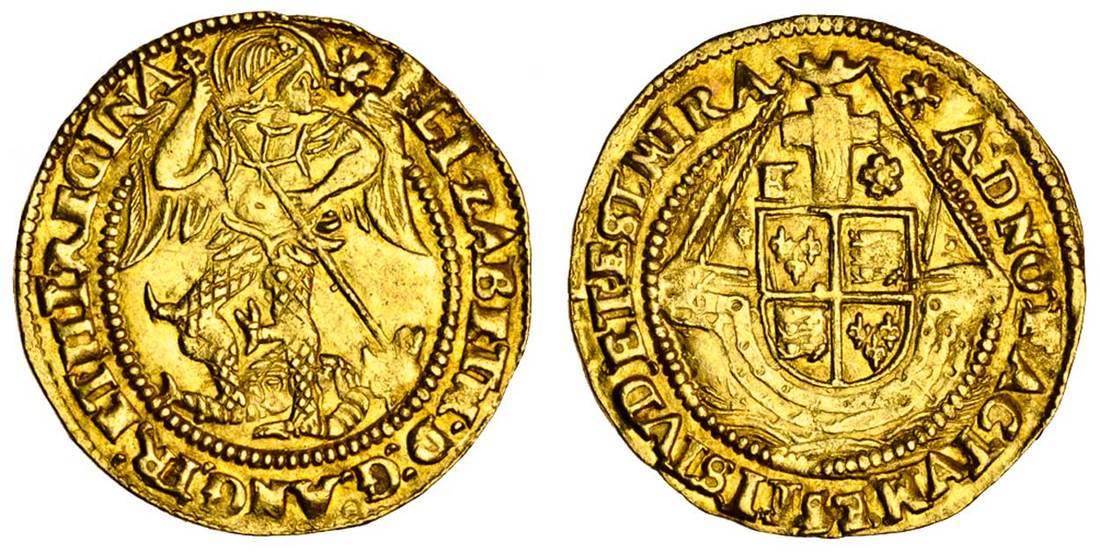 (x) Elizabeth I (1558-1603), third issue 1573-78, Half Angel, 2.61g, m.m. eglantine, elizabeth d g ang fr et hi regina, St. Michael standing vanquishing Satan, rev. a dno factvm est istvd et est mira, cross dividing e and rose above shield within ship, crescent or double crescent stops (Schneider 771 same dies; N.1992/1; S.2517), an excellent coin, unusually fine and crisp on a full round flan, extremely fine, very rare thus