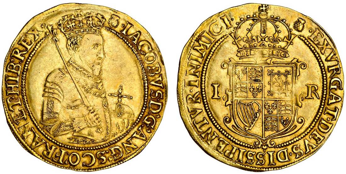 (x) James I (1603-1625), first coinage, Sovereign, 11.07g, m.m. thistle, iacobvs d g ang sco fran et hib rex, first bust crowned right, holding orb and shouldering sceptre, wearing plain armour, rev. exvrgat devs disipentvr inimici, crowned shield, ir at sides (Schneider 1; N.2066; S.2608), very fine, reverse good very fine
