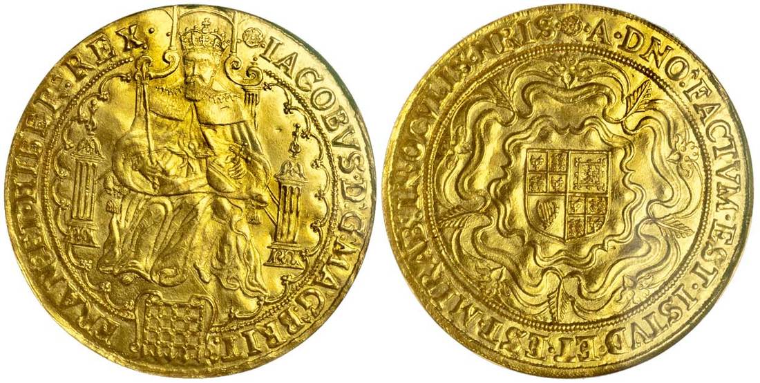 (x) James I (1603-1625), second coinage 1604-19, Rose Ryal of 30-Shillings, m.m. rose, iacobvs d g mag brit fran et hiber rex, king enthroned facing, portcullis at feet, throne back with scrolling, rev. a dno factvm est istvd et est mirab in ocvlis nris, shield on rose (Schneider 6 same dies; N.2079; S.2613), on a full, broad flan, with a crisp strike showing the tiniest details exquisitely, the important centers (normally weak even on the finest pieces) being sharply defined, rare, more so in this remarkable quality, NGC graded MS-64