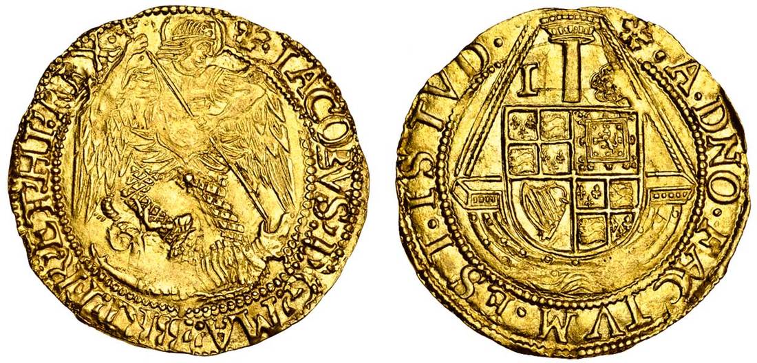 (x) James I (1603-1625), second coinage, Angel, 4.65g, m.m. cinquefoil, iacobvs d g ma bri fr et hi rex, St Michael vanquishing Satan, rev. a dno factvm est istvd, i and rose above shield within ship (N.2081; S.2615), slightly double struck on obverse and a light scratch on the reverse, well struck and about extremely fine