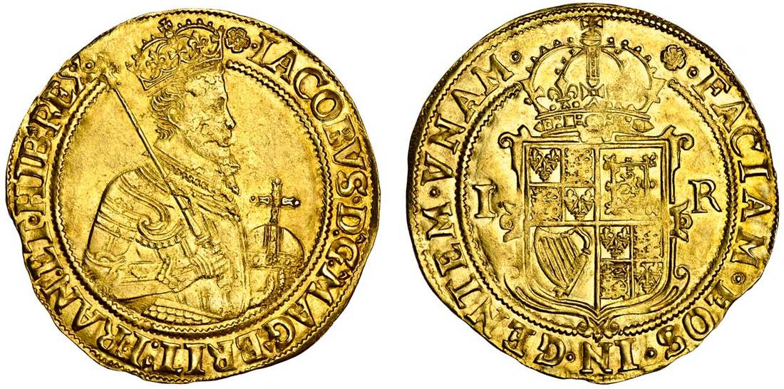 (x) James I (1603-1625), second coinage, Unite, 9.94g, m.m. rose, iacobvs d g mag brit fran et hib rex, fourth bust crowned right, wearing plain armour, holding orb and shouldering sceptre, rev. faciam eos in gentem vnam, crowned shield dividing i-r (N.2084; S.2619), extremely fine