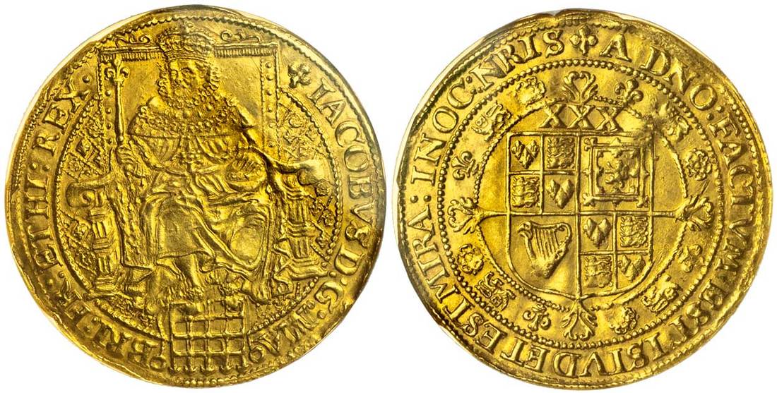 (x) James I (1603-1625), third coinage 1619-25, Rose Ryal of Thirty Shillings, m.m. trefoil, iacobvs d g ma bri fr et hi rex, king enthroned facing, plain back to throne, rev. a dno factvm est istvd et est mira in oc nris, shield on rose (Schneider 78 same dies; N.2108; S.2633), lustrous, on a full flan with complete legends, and lovely original colour, sharply detailed on the king’s face, rare in this condition. NGC graded MS-63