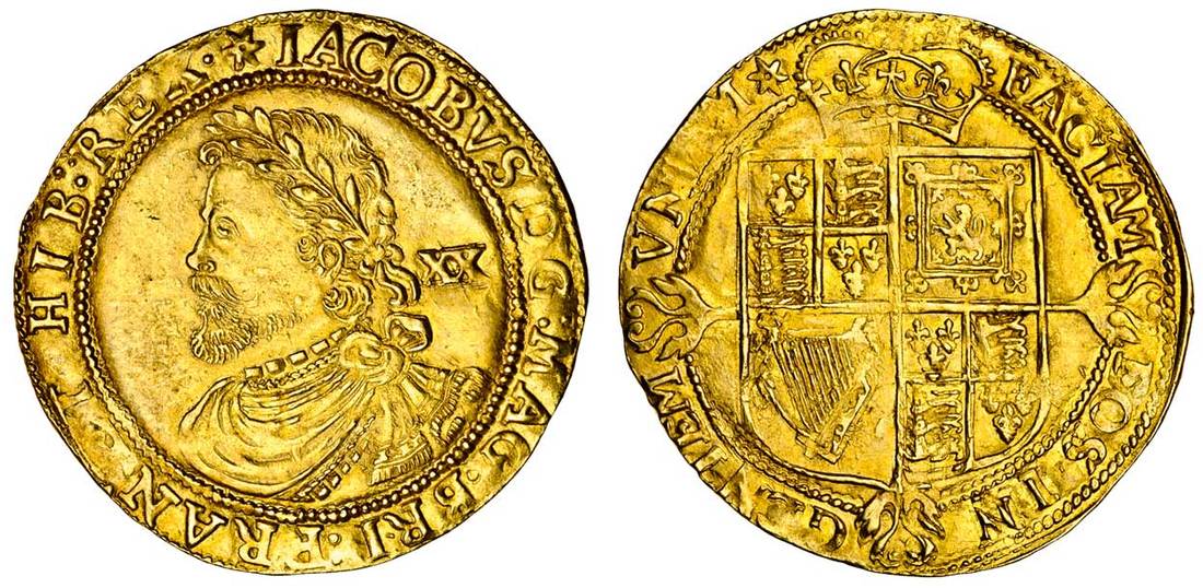 (x) James I (1603-1625), third coinage, Laurel, 8.95g, m.m. spur rowel, iacobvs d g mag bri fran et hib rex, second laureate bust left, mark of value behind, rev. faciam eos in gentem vnam, crowned shield on long cross fleury, m.m. to left of crown (Schneider 83; N.2112; S.2638), extremely fine with superb portrait