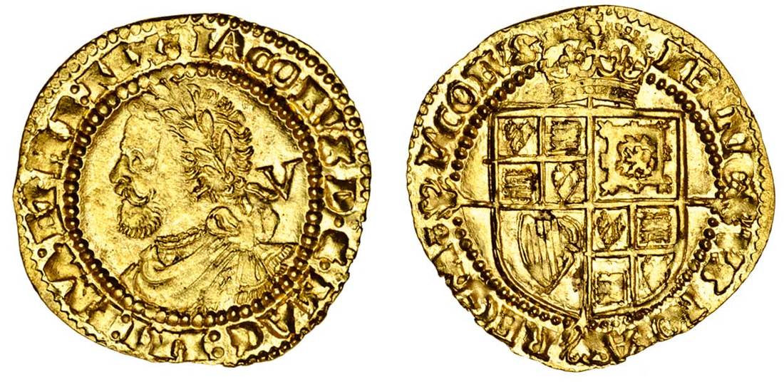 (x) James I (1603-1625), third coinage 1621-23, Gold Crown or Quarter-Laurel, 2.26g, m.m. thistle, iacobvs d g mag bri fr et hi rex, second laureate bust left, mark of value behind, rev. henricvs rosas regna iacobvs, shield on long cross fleury, m.m. after regna (Schneider 95-96; N.2118, S.2642), extremely fine, rare