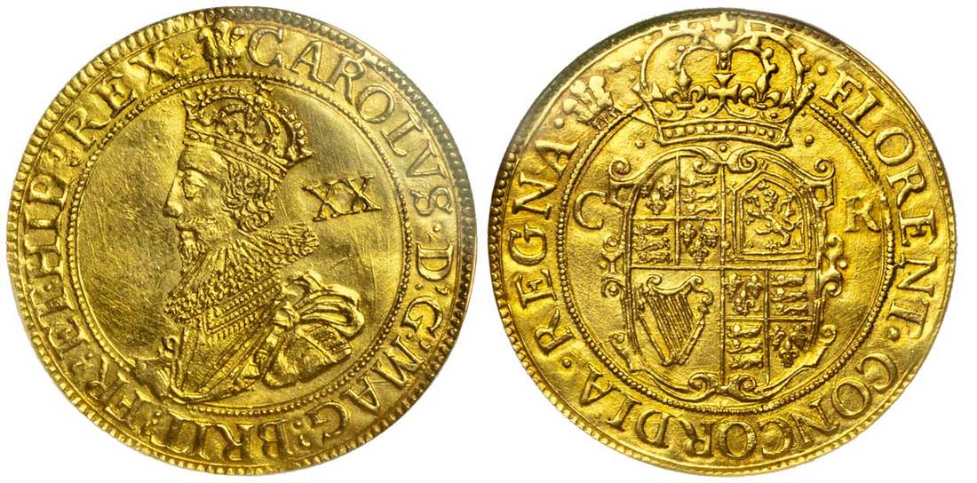 (x) Charles I (1625-1649), Unite, Tower mint, Group C, m.m. plume, carolvs d g mag brit fr et hib rex, third high-crowned bust left, rev. florent concordia regna, crowned and garnished oval shield dividing c-r (N.2150; S.2690), lustrous, a splendid example, unusually round, full flan, the legends all sharp, with full outer beading, well detailed on portrait, reddish gold surfaces, NGC graded AU-58