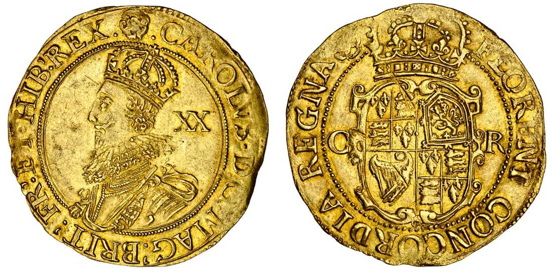 (x) Charles I (1625-1649), Unite, 9.17g, Tower mint, group C, class IIa, Unite, m.m. rose (over plume on obv.), carolvs d g mag brit fr et hib rex, crowned bust left, wearing armour and ruff, rev. florent concordia regna, crowned oval shield dividing c-r (Schneider 140; Brooker 71, this coin; N.2150; S.2690), legends weak in places, otherwise good very fine with an exceptionally well struck portrait
