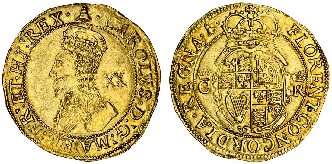 (x) Charles I (1625-1649), Unite, 8.95g, Tower mint, group D, class IIa/IIb, Unite, m.m. bell (large on obv., small on rev.), carolvs d g ma br fr et hi rex, crowned bust left wering falling lace collar, value xx behind, rev. florent concordia regna, crowned oval shield dividing crowned c-r (Schneider 151; SCBI Brooker 89, this coin; N.2153; S. 2692), extremely fine