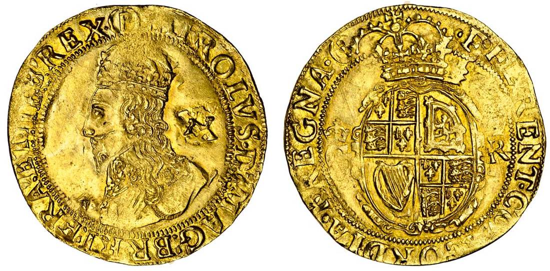 (x) Charles I (1625-1649), Unite, 8.99g, Tower mint, group D, class IIa/IIb, m.m. (p), carolvs d g mag bri fra et hib rex, crowned bust left wearing falling lace collar, rev. florent concordia regna, crowned oval shield dividing crowned c-r (Schneider 160; SCBI Brooker 117, this coin; N.2153; S.2693), double-struck, otherwise very fine, very rare