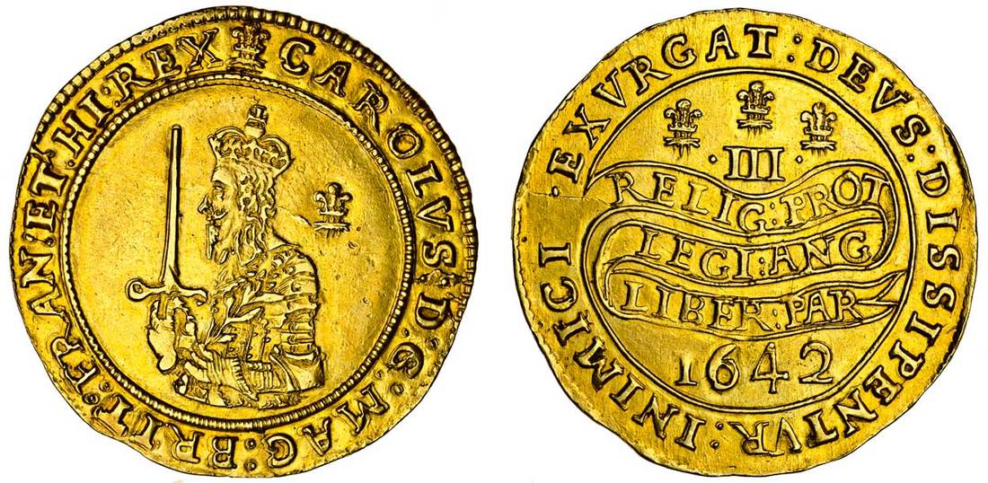 (x) Charles I (1625-1649), Oxford, Triple Unite, 26.96g, 1642, on a larger module flan, m.m. Oxford plume, carolvs: d:g: mag: brit: fran: et: hi: rex, improvised “Shrewsbury” crowned half-length bust of king left, in armour, holding sword and olive branch, plumes behind, rev. .exvrgat: devs: dissipentvr: inimici, declaration relig: prot legi: ang liber: par in three lines on continuous scroll, value and three plumes above, date below (B-J dies III/L1; cf. Schneider 287 (same obv. die); N.2382; S.2724), an imposing and most handsome coin, on a full round flan, with attractive golden tone, and a strong portrait, almost extremely fine, very rare with declaration on continuous scroll
