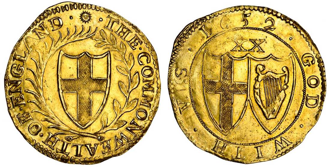 (x) Commonwealth (1649-1660), Unite, 9.01g, 1652, m.m. sun, the commonwealth of england, shield of St. George within a wreath formed of a palm and laurel branch, rev. god with vs, conjoined shields of St. George and Ireland, xx above (cf. Schneider 341; N.2715; S.3208), extremely fine, scarce date