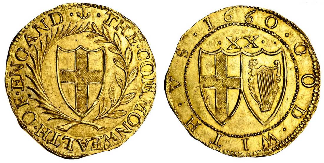 (x) Commonwealth (1649-1660), Unite, 9.02g, 1660, m.m. anchor, the commonwealth of england, shield of St. George within a wreath formed of a palm and laurel branch, rev. god with vs, conjoined shields of St. George and Ireland, xx above (cf. Schneider 347; N.2716, S. 3209), usual slightly irregular flan, slightly double struck in places, an exceptional example, superb extremely fine, extremely rare