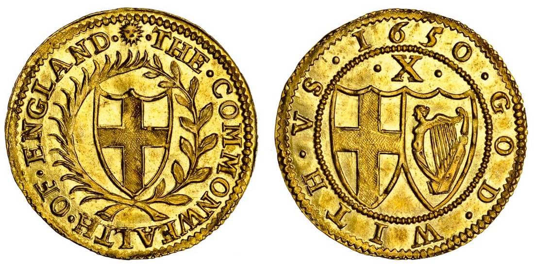 (x) Commonwealth (1649-1660), Double-Crown of 10 Shillings, 4.55g, 1650, m.m. sun, the commonwealth of england, shield of St. George within wreath, rev. god with vs, conjoined shields of England and Ireland, x above (Schneider 349; N.217; S.3210), choice extremely fine and about uncirculated, wholly round and totally lustrous, precisely struck and detailed, a beautiful specimen, in mint state, rare in this condition