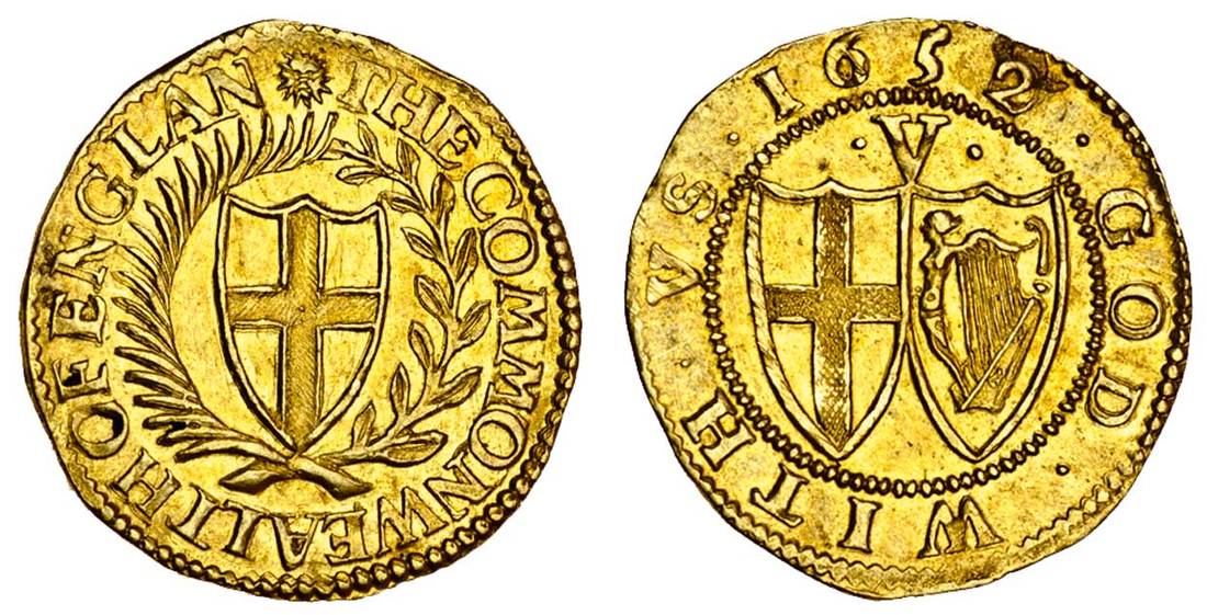 (x) Commonwealth (1649-1660), Gold Crown, 2.21g, 1652/0, m.m. sun, the commonwealth of englan, shield of St. George within a wreath formed of a palm and laurel branch, rev. god with vs, conjoined shields of St. George and Ireland, v above (Schneider 360; N.2719, S.3212), extremely fine or better on a perfectly round flan