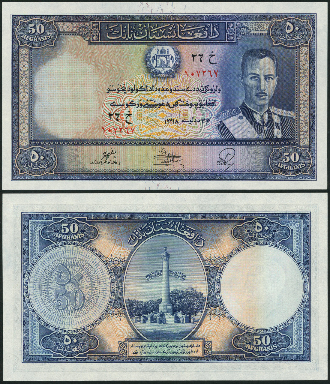 (x) Bank of Afghanistan, 50 afghanis, 1939, serial number 107267, blue, King Muhammad Zahir at right