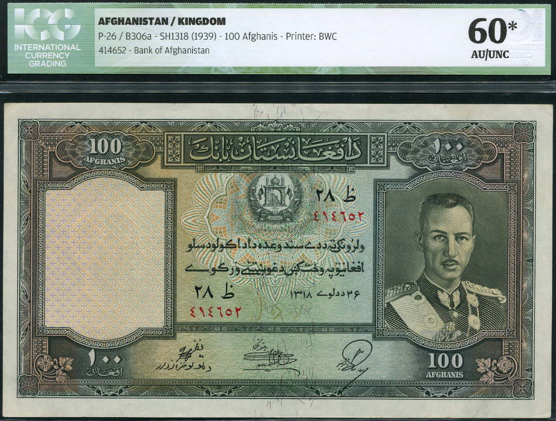 (x) Bank of Afghanistan, 100 afghanis, SH 1318 (1939), red serial numbers, green and lilac, King Muhammad Zahir at right, arms top centre, reverse green, the Mausoleum of Ahmad Shah Durrani in Kandahar at centre