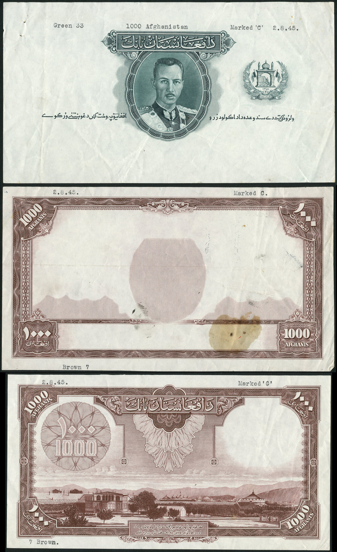 Bank of Afghanistan, obverse and reverse die proof 1000 afghanis, ND (1954), first green, King Muhammad Zahir at centre in ornate frame, Bank title at top, arms at left, second brown print, ornate border with value in each corner, reverse brown print, city skyline and mountain range in background