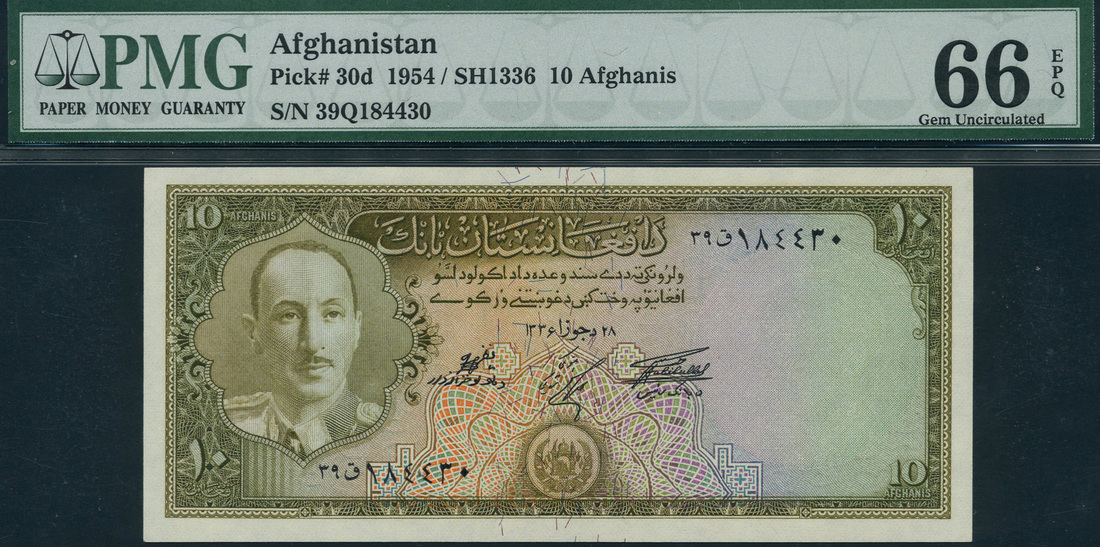 (x) Bank of Afghanistan, 10 afghanis, SE 1336 (1957), prefix 39Q, brown and lilac and pale green, King Muhammad Zahir at left, arms low centre, Achekzai signature, reverse brown, Palace garden