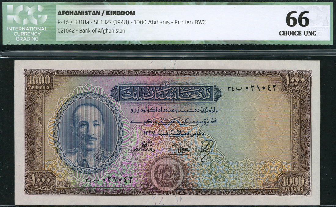 (x) Bank of Afghanistan, 1000 afghanis, SH 1327 (1948), black serial numbers, purple-brown and multicoloured, King Muhammad Zahir at left, arms low centre, reverse purple-brown, city and mountains, value at each corner
