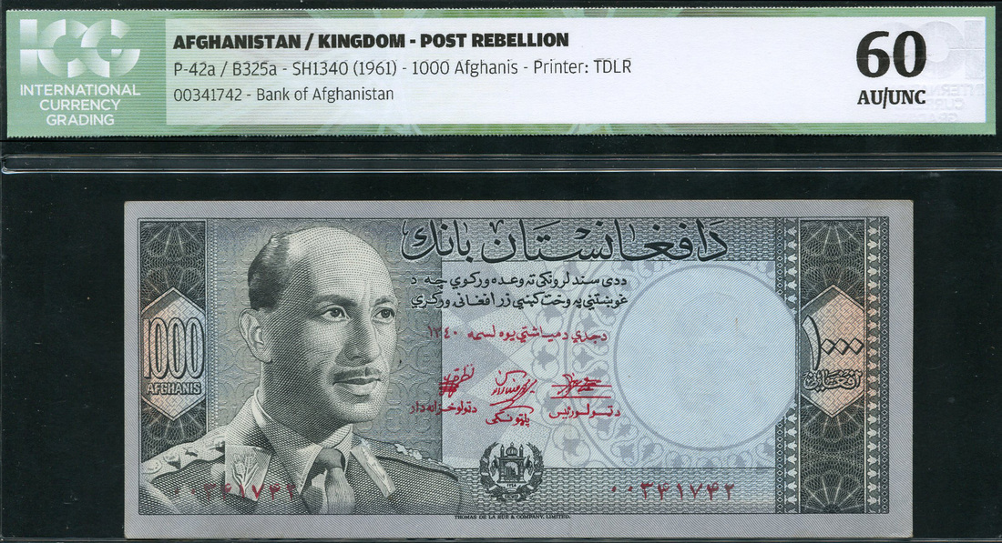 (x) Bank of Afghanistan, 1000 afghanis, SE 1340 (1961), grey and pale blue, King Muhammad Zahir at left, arms in field, reverse grey, the arch of Qala-e-Bost