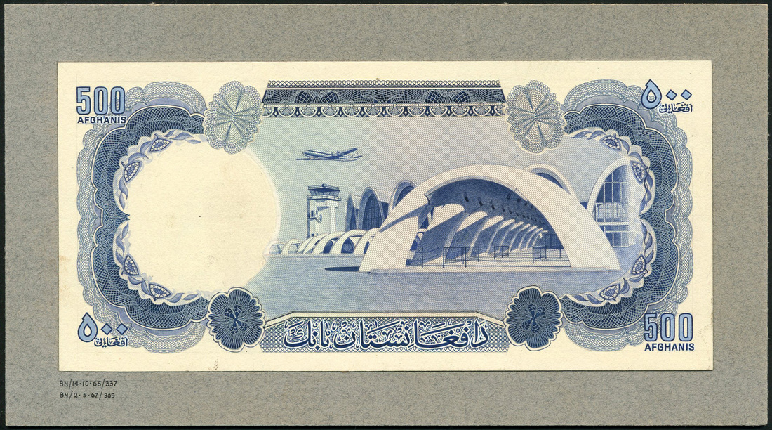 (†) Bank of Afghanistan, composite reverse essay for a 500 afghanis, ND (1965-1967), blue, Kandahar airport and a Douglas DC7, also reverse 1000 afghanis, ND (style of 1969), courtyard